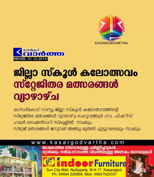 ചെറുവത്തൂര്: (www.kasargodvartha.com 31.12.2014) കാസര്കോട് റവന്യൂ ജില്ലാ സ്കൂള് കലോത്സവത്തിന്റെ സ്റ്റേജിതര മത്സരങ്ങള് വ്യാഴാഴ്ച ചെറുവത്തൂര് ഗവ. ഫിഷറീസ് ഹയര് സെക്കന്ഡറി സ്കൂളില് നടക്കും. സ്റ്റേജ് മത്സരങ്ങള് ജനുവരി അഞ്ചു മുതല് എട്ടുവരെയും നടക്കും.