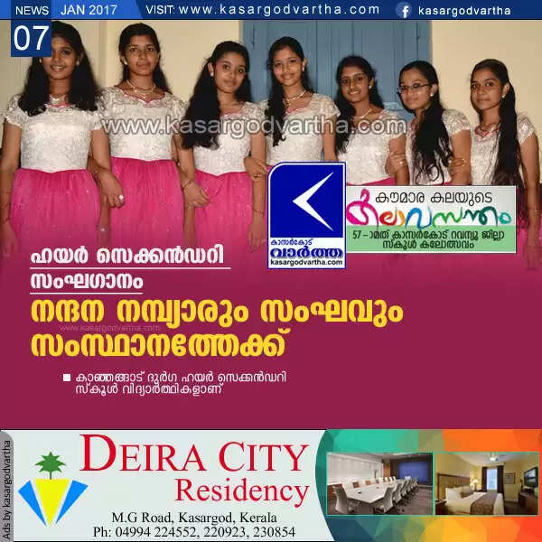 തൃക്കരിപ്പൂര്‍: (www.kasargodvartha.com 07/01/2017) ജില്ലാ സ്‌കൂള്‍ കലോത്സവത്തില്‍ ഹയര്‍ സെക്കന്‍ഡറി സ്‌കൂള്‍ സംഘഗാന മത്സരത്തില്‍ നന്ദന നമ്പ്യാരും സംഘവും ഒന്നാം സ്ഥാനം നേടി സംസ്ഥാന തല മത്സരത്തിലേക്ക് അര്‍ഹത നേടി. കാഞ്ഞങ്ങാട് ദുര്‍ഗ ഹയര്‍ സെക്കന്‍ഡറി സ്‌കൂള്‍ വിദ്യാര്‍ത്ഥികളാണ്.