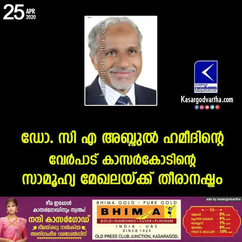 ഡോ. സി എ അബ്ദുല് ഹമീദിന്റെ വേര്പാട് കാസര്കോടിന്റെ സാമൂഹ്യ മേഖലയ്ക്ക് തീരാനഷ്ടം