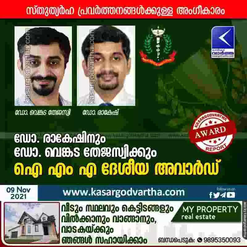 Keywords: Kerela, Kasaragod, News, Doctors, Award, Delhi, Dr. Rakesh and Dr. Venkata Tejaswi wins IMA National Award.