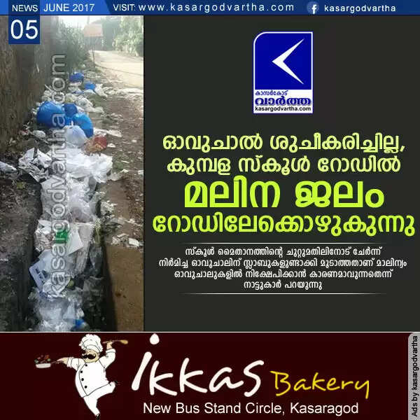 ഓവുചാല് ശുചീകരിച്ചില്ല, കുമ്പള സ്കൂള് റോഡില് മലിന ജലം റോഡിലേക്കൊഴുകുന്നു