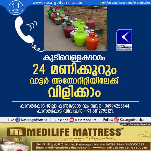 Keywords:  24 hrs call center opened, Kasaragod, news, Water authority, Drinking water, drinking water famine, 24 hrs call center opened by water authority