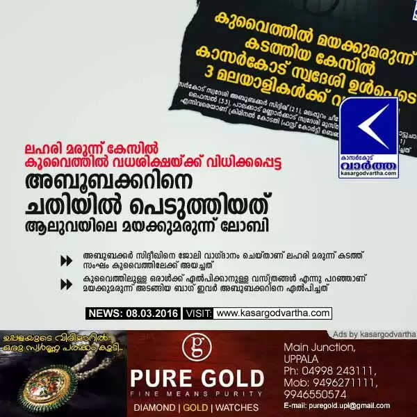 കാഞ്ഞങ്ങാട്: (www.kasargodvartha.com 08/03/2016) ഹെറോയിന് കടത്തിയ കേസില് കുവൈത്ത് കോടതി വധശിക്ഷയ്ക്ക് വിധിക്കപ്പെട്ട മൂന്ന് മലയാളികളില് കാസര്കോട്ടുകാരനായ അബൂബക്കറിനെ ചതിയില് പെടുത്തിയത് എറണാകുളം ആലുവയിലെ മയക്കുമരുന്ന് ലോബി. അബൂബക്കര് സിദ്ദീഖിനെ ജോലി വാഗ്ദാനം ചെയ്താണ് ലഹരി മരുന്ന് കടത്ത് സംഘം കുവൈത്തിലേക്ക് അയച്ചത്. ജോലി കിട്ടുമ്പോള് വിസയുടെ പണം ഘട്ടം ഘട്ടമായി നല്കണമെന്നാണ് ഇവര് അബൂബക്കറിനോട് പറഞ്ഞത്.