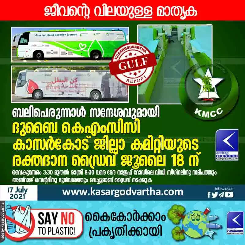 ബലിപെരുന്നാൾ സന്ദേശവുമായി ദുബൈ കെഎംസിസി കാസർകോട് ജില്ലാ കമിറ്റിയുടെ രക്തദാന ഡ്രൈവ് ജൂലൈ 18 ന്