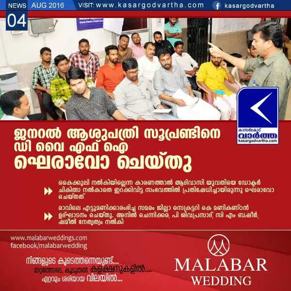 ജനറല് ആശുപത്രി സൂപ്രണ്ടിനെ ഡി വൈ എഫ് ഐ ഘെരാവോ ചെയ്തു