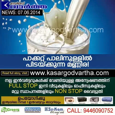 ഉപ്പള: (www.kasargodvartha.com 07.06.2014) പാക്കറ്റ് പാലിനുള്ളില് ജീവനുള്ള മണ്ണിരയെ കണ്ടെത്തി. കര്ണാടകയില് നിന്നും ഉപ്പളയില് വിതരണത്തിനെത്തിച്ച പാല് പാക്കറ്റിലാണ് ജീവനുള്ള മണ്ണിരയെ കണ്ടെത്തിയത്. പത്വാടിയിലെ അഷ്റഫ് ഉപ്പള ടൗണില് നിന്നും വാങ്ങിയ പാല് വീട്ടില് കൊണ്ടുപോയി നോക്കിയപ്പോഴാണ് മണ്ണിരയെ കണ്ടെത്തിയത്.