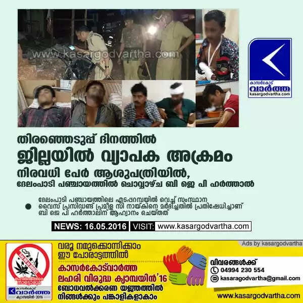 തിരഞ്ഞെടുപ്പ് ദിനത്തില്‍ ജില്ലയില്‍ വ്യാപക അക്രമം; നിരവധി പേര്‍ ആശുപത്രിയില്‍, ദേലംപാടി പഞ്ചായത്തില്‍ ചൊവ്വാഴ്ച ബി ജെ പി ഹര്‍ത്താല്‍