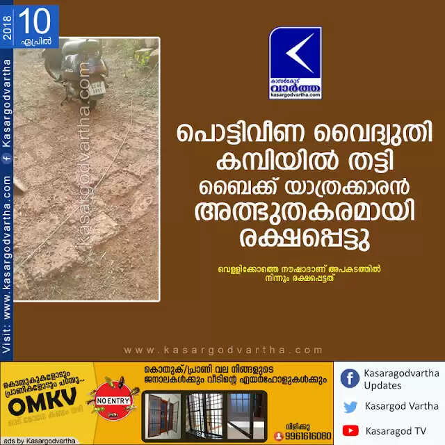 പൊട്ടിവീണ വൈദ്യുതി കമ്പിയില് തട്ടി ബൈക്ക് യാത്രക്കാരന് അത്ഭുതകരമായി രക്ഷപ്പെട്ടു