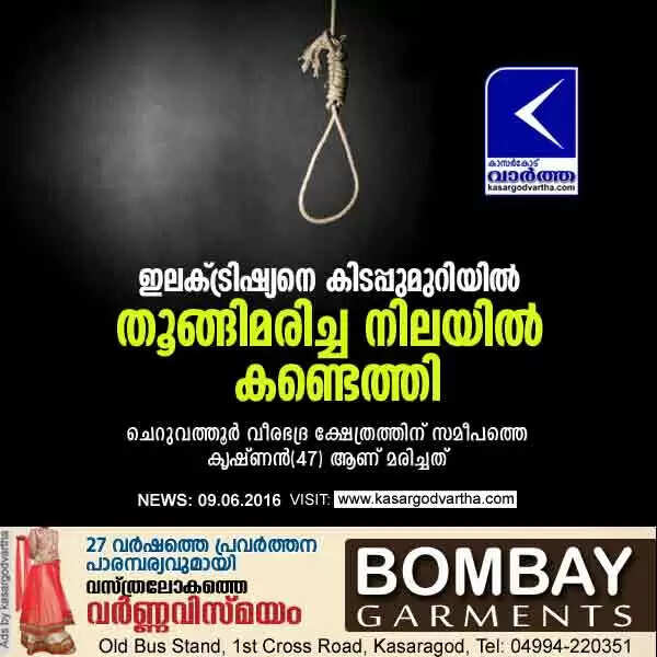 Keywords: Kasaragod, Suicide, Cheruvathur, Temple, Electrician, Krishnan, Wednesday, Food, Night, Police, Deadbody, Hospital.