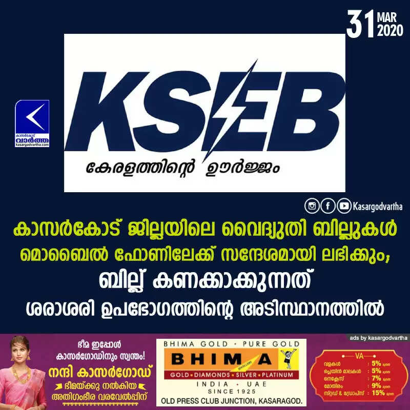 കാസര്‍കോട്: (www.kasargodvartha.com 01.04.2020) ലോക് ഡൗണ്‍ നിലനില്‍ക്കുന്ന സാഹചര്യത്തില്‍ ജില്ലയിലെ വൈദ്യുതി ഉപഭോക്താക്കളുടെ ബില്ല് ശരാശരി ഉപഭോഗത്തിന്റെ അടിസ്ഥാനത്തില്‍ തുക കണക്കാക്കി സെക്ഷന്‍ ഓഫീസില്‍ രജിസ്റ്റര്‍ ചെയ്തിട്ടുള്ള മൊബൈല്‍ നമ്പറിലേക്ക് സന്ദേശമായി അയക്കും.
