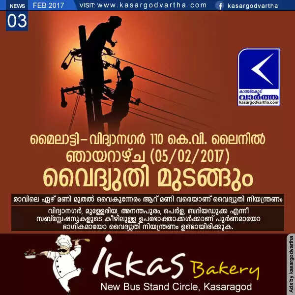 മൈലാട്ടി - വിദ്യാനഗര് 110 കെ.വി. ലൈനില് ഞായറാഴ്ച (05/02/2017) വൈദ്യുതി മുടങ്ങും