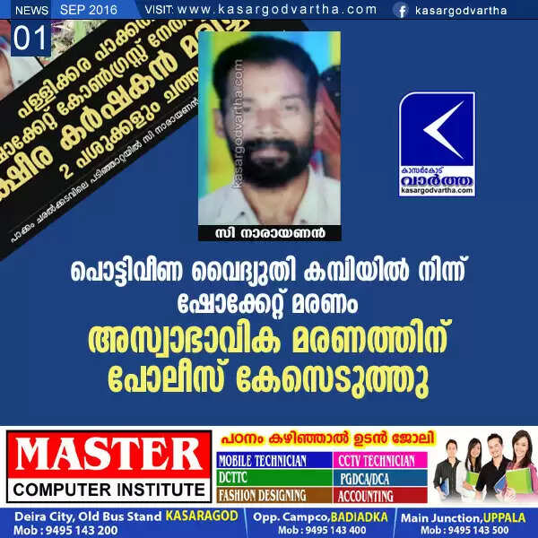 ബേക്കല്: (www.kasargodvartha.com 01/09/2016) പൊട്ടിവീണ വൈദ്യുതി കമ്പിയില് നിന്ന് ഷോക്കേറ്റ് ക്ഷീര കര്ഷകനായ കോണ്ഗ്രസ് നേതാവ് മരണപ്പെട്ട സംഭവത്തില് അസ്വാഭാവിക മരണത്തിന് പോലീസ് കേസെടുത്തു. ക്ഷീര കര്ഷകനും കോണ്ഗ്രസിന്റെ പ്രാദേശിക നേതാവുമായ പാക്കം ചരല്ക്കടവിലെ പടിഞ്ഞാറ്റയില് സി നാരായണന് നായര് ബുധനാഴ്ച രാവിലെയാണ് പശുക്കളെ മേയ്ക്കാനായി ഭാര്യയോടൊപ്പം വയലിലേക്ക് പോയപ്പോള് ഷോക്കേറ്റ് മരിച്ചത്.