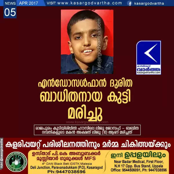 നീലേശ്വരം: (www.kasargodvartha.com 05.03.2017) എന്ഡോസള്ഫാന് ദുരിതബാധിതനായ കുട്ടി മരിച്ചു. രാജപുരം കുടിയിരിപ്പില് ഹൗസിലെ ലിജു ജോസഫ് - ബബിത ദമ്പതികളുടെ മകന് അക്ഷത് ലിജു (10) ആണ് മരിച്ചത്.