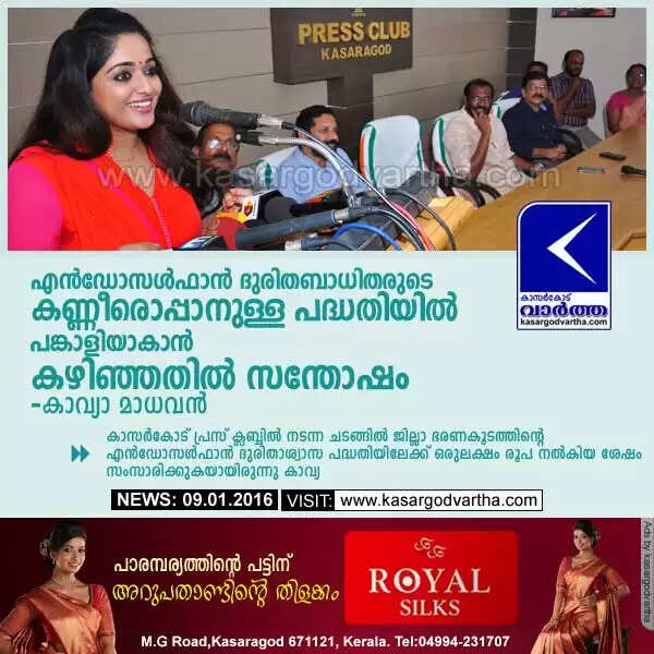 എന്ഡോസള്ഫാന് ദുരിതബാധിതരുടെ കണ്ണീരൊപ്പാനുള്ള പദ്ധതിയില് പങ്കാളിയാകാന് കഴിഞ്ഞതില് സന്തോഷം: കാവ്യാ മാധവന്