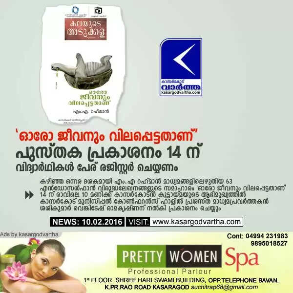 കാസര്കോട്: (www.kasargodvartha.com 10/02/2016) കഴിഞ്ഞ ഒന്നര ദശകമായി എം.എ റഹ് മാന് മാധ്യമങ്ങളിലെഴുതിയ 63 എന്ഡോസള്ഫാന് വിരുദ്ധലേഖനങ്ങളുടെ സമാഹാരം ' ഓരോ ജീവനും വിലപ്പെട്ടതാണ്' 14 ന് രാവിലെ 10 മണിക്ക് കാസര്കോടന് കൂട്ടായ്മയുടെ ആഭിമുഖ്യത്തില് കാസര്കോട് മുനിസിപ്പല് കോണ്ഫറന്സ് ഹാളില് പ്രശസ്ത മാധ്യമപ്രവര്ത്തകന് ശശികുമാര് വെങ്കിടേഷ് രാമകൃഷ്ണന് നല്കി പ്രകാശനം ചെയ്യും. കൈരളി ബുക്സ് ആണ് പ്രസാധകര്.