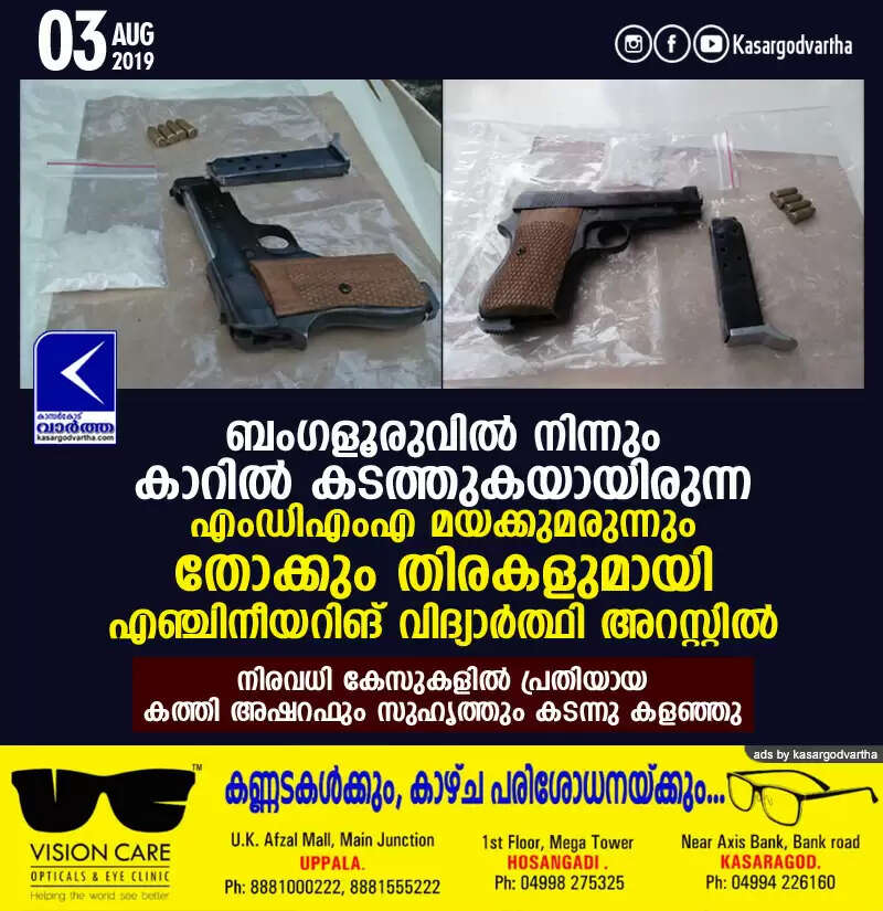 < !- START disable copy paste --> Keywords: Bekal, News, Kasaragod, Kerala, arrest, Student, case, Police, Enquiry, Escaped, Car, Court, Engineering student arrested with drugs and pistol