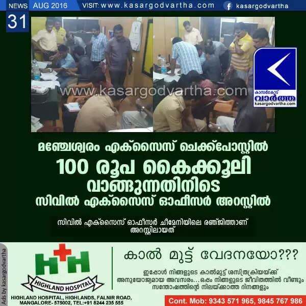 മഞ്ചേശ്വരം എക്സൈസ് ചെക്ക്പോസ്റ്റില് 100 രൂപ കൈക്കൂലി വാങ്ങുന്നതിനിടെ സിവില് എക്സൈസ് ഓഫീസര് അറസ്റ്റില്