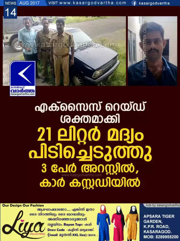 എക്സൈസ് റെയ്ഡ് ശക്തമാക്കി; 21 ലിറ്റര് മദ്യം പിടിച്ചെടുത്തു, 3 പേര് അറസ്റ്റില്, കാര് കസ്റ്റഡിയില്