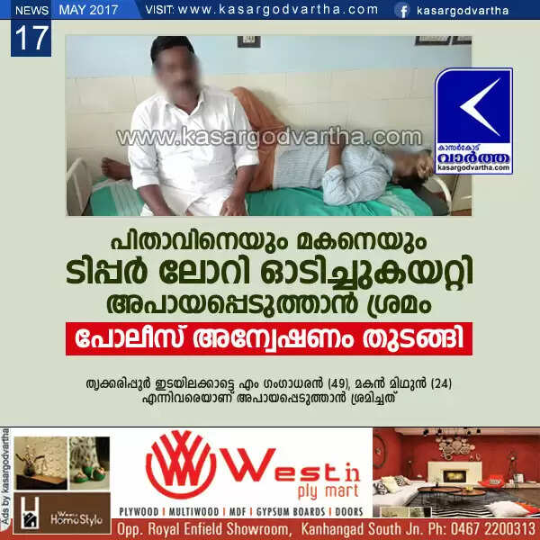 തൃക്കരിപ്പൂര്‍: (www.kasargodvartha.com 17.05.2017) റോഡരികില്‍ നില്‍ക്കുകയായിരുന്ന പിതാവിനെയും മകനെയും ടിപ്പര്‍ ലോറി ഓടിച്ചുകയറ്റി അപായപ്പെടുത്താന്‍ ശ്രമിച്ചുവെന്ന പരാതിയില്‍ പോലീസ് അന്വേഷണം തുടങ്ങി. ബുധനാഴ്ച രാത്രി ഒമ്പത് മണിയോടെ ഇടയിലക്കാടാണ് സംഭവം. ലോറിയിടിച്ച് ഗുരുതരമായി പരിക്കേറ്റ ഇടയിലക്കാട് സ്വദേശികളായ എം ഗംഗാധരന്‍ (49), മകന്‍ മിഥുന്‍ (24) എന്നിവരെ ചെറുവത്തൂരിലെ കെ എച്ച് ആശുപത്രിയില്‍ പ്രവേശിപ്പിച്ചു.