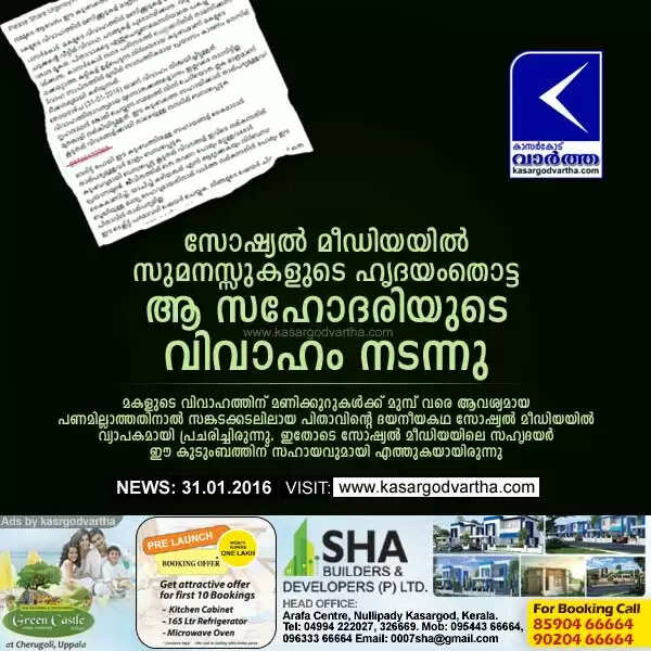 കാസര്‍കോട്: (www.kasargodvartha.com 31/01/2016) രണ്ട് ദിവസമായി സോഷ്യല്‍ മീഡിയയില്‍ സുമനസ്സുകളുടെ ഹൃദയം നീറ്റിയ, ആ സഹോദരിയുടെ വിവാഹം നിശ്ചയിച്ച സമയത്ത് തന്നെ നടന്നു. മകളുടെ വിവാഹത്തിന് മണിക്കൂറുകള്‍ക്ക് മുമ്പ് വരെ ആവശ്യമായ പണമില്ലാത്തതിനാല്‍ സങ്കടക്കടലിലായ പിതാവിന്റെ ദയനീയ കഥ സോഷ്യല്‍ മീഡിയയില്‍ വ്യാപകമായി പ്രചരിച്ചിരുന്നു. ഇതോടെ സഹൃദയര്‍ ഈ കുടുംബത്തിന് സഹായവുമായി എത്തുകയായിരുന്നു. www.kasargodvartha.com