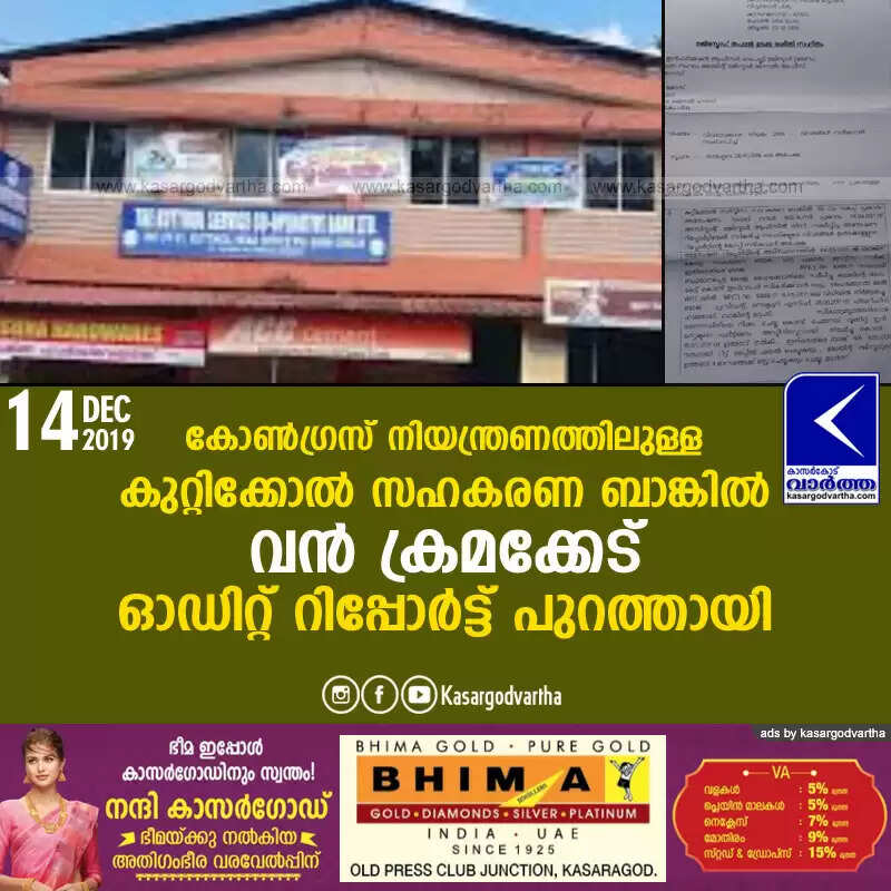 കോണ്ഗ്രസ് നിയന്ത്രണത്തിലുള്ള കുറ്റിക്കോല് സഹകരണ ബാങ്കില് വന് ക്രമക്കേട്; ഓഡിറ്റ് റിപ്പോര്ട്ട് പുറത്തായി