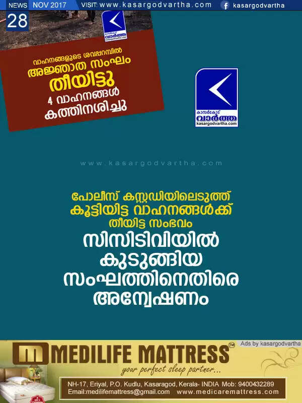 Keywords: Kasaragod, Kerala, News, Police, Custody, Vehicles, Investigation, Fire force, Natives, Fire case; Accused in CCTV, Police investigation started.