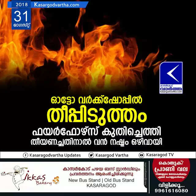 ഓട്ടോ വര്ക്ക്ഷോപ്പില് തീപ്പിടുത്തം; ഫയര്ഫോഴ്സ് കുതിച്ചെത്തി തീയണച്ചതിനാല് വന് നഷ്ടം ഒഴിവായി