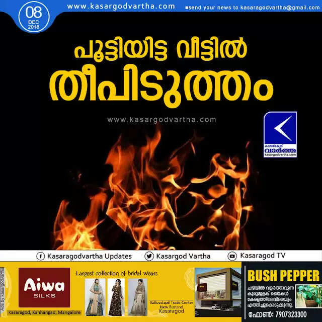 Keywords: Kasaragod, Naimaramoola, House, Fire, News, Fire in Naimaramoola, Fire in closed home.