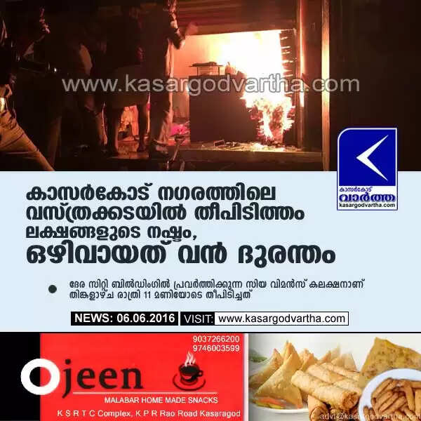 കാസര്‍കോട് നഗരത്തിലെ വസ്ത്രക്കടയില്‍ തീപിടിത്തം; ലക്ഷങ്ങളുടെ നഷ്ടം, ഒഴിവായത് വന്‍ ദുരന്തം