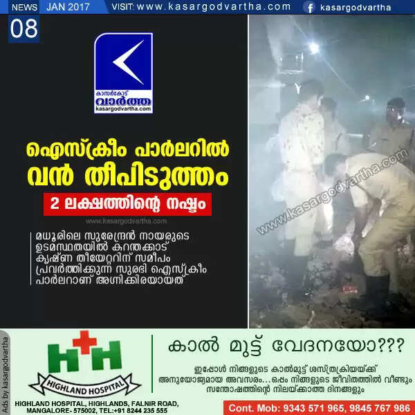 Keywords: Kasaragod, Kerala, Fire, Fire force, Fire in Ice cream parlor.