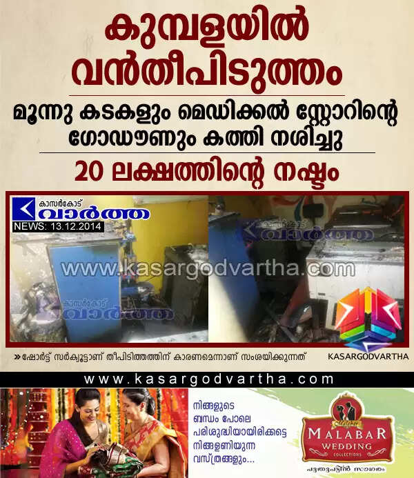 കുമ്പളയില് വന്തീപിടുത്തം; മൂന്നു കടകളും മെഡിക്കല് സ്റ്റോറിന്റെ ഗോഡൗണും കത്തി നശിച്ചു, 20 ലക്ഷത്തിന്റെ നഷ്ടം