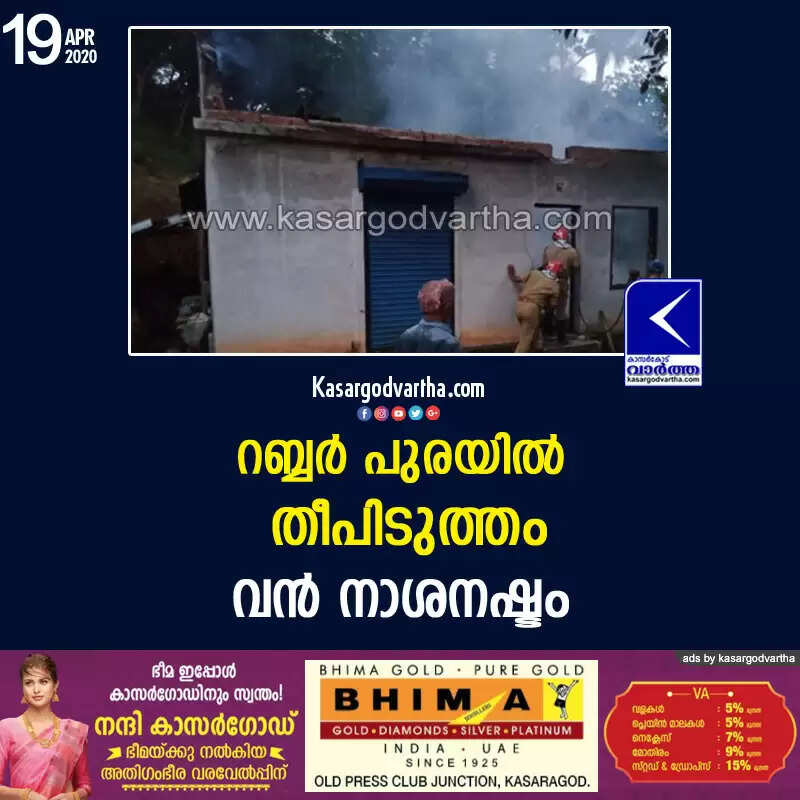 കാഞ്ഞങ്ങാട്: (www.kasargodvartha.com;19.04.2020) റബ്ബര് പുരയില് തീപിടുത്തം. വന് നാശനഷ്ടം സംഭവിച്ചു. കരിന്തളം കാട്ടി പൊയില് എറണാകുളം സ്വദേശി ആനി മാത്യുവിന്റെ ഉടമസ്ഥതയിലുള്ള റബ്ബര്പുരയിലാണ് തീപിടുത്തമുണ്ടായത്. 20 ക്വിന്റലോളം റബ്ബര് ഷീറ്റുകള് കത്തിനശിച്ചു. ഞായറാഴ്ച പുലര്ച്ചെ അഞ്ചു മണിയോടെയാണ് സംഭവം.