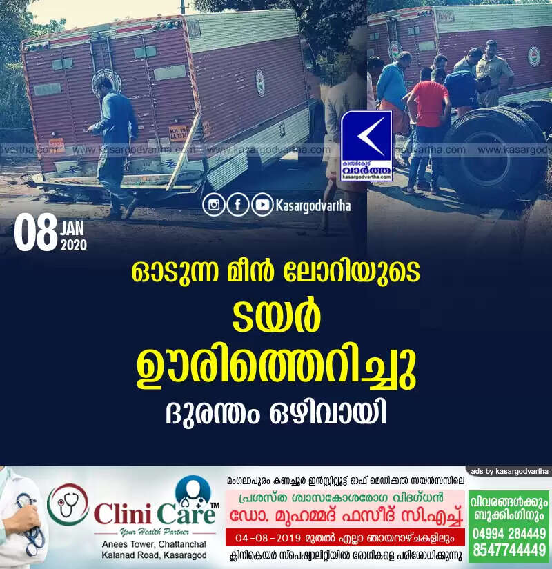 ചെര്‍ക്കള: (www.kasargodvartha.com 08.01.2020) ഓടുന്ന മീന്‍ ലോറിയുടെ ടയര്‍ ഊരിത്തെറിച്ചു. ഭാഗ്യം കൊണ്ടാണ് വന്‍ ദുരന്തം ഒഴിവായത്. കാസര്‍കോട് നിന്നും കാഞ്ഞങ്ങാട്ടേക്ക് പോവുകയായിരുന്ന കെ എ 19 എ എ 7374 നമ്പര്‍ മീന്‍ ലോറിയാണ് അപകടത്തില്‍പെട്ടത്.