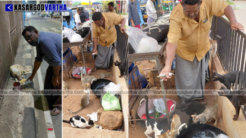 Article Summary: Sharif-Asainar, a fish vendor in Mogral, stands out for his kindness in feeding 15 cats and 2 dogs daily before starting his sales.