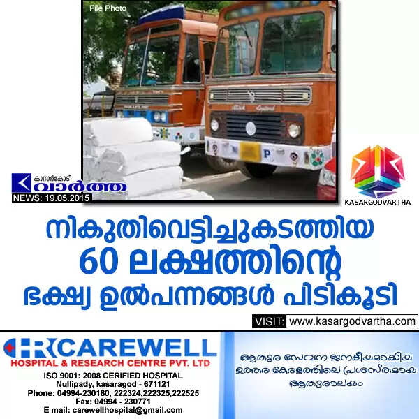 കാസര്കോട്: (www.kasargodvartha.com 19.05.2015) നികുതിവെട്ടിച്ചുകടത്തിയ 60 ലക്ഷത്തിന്റെ ഭക്ഷ്യ ഉല്പന്നങ്ങളും മറ്റും പിടികൂടി. മുംബൈയില് നിന്നും രണ്ട് ലോറികളിലായി കൊച്ചിയിലേക്ക് കടത്തുകയായിരുന്ന ഭക്ഷ്യ ഉല്പന്നങ്ങളും മറ്റുമാണ് നുള്ളിപ്പാടിയില്വെച്ച് തിങ്കളാഴ്ച രാത്രി പിടികൂടിയത്.