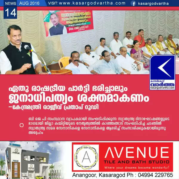 കാഞ്ഞങ്ങാട്: (www.kasargodvartha.com 14/08/2016) ഏതു രാഷ്ട്രീയ പാര്ട്ടി ഭരിച്ചാലും രാജ്യത്ത് ജനാധിപത്യം ശക്തമായിരിക്കണമെന്ന് കേന്ദ്ര മന്ത്രി രാജീവ് പ്രതാപ് റൂഡി. ബി ജെ പി സംസ്ഥാന വ്യാപകമായി സംഘടിപ്പിക്കുന്ന സ്വാതന്ത്ര്യ ദിനാഘോഷങ്ങളുടെ ഭാഗമായി ജില്ലാ കമ്മിറ്റിയുടെ നേതൃത്വത്തില് കാഞ്ഞങ്ങാട് സംഘടിപ്പിച്ച ചടങ്ങില് സ്വാതന്ത്ര്യ സമര സേനാനികളെ സേനാനികളെ ആദരിച്ച് സംസാരിക്കുകയായിരുന്നു അദ്ദേഹം.