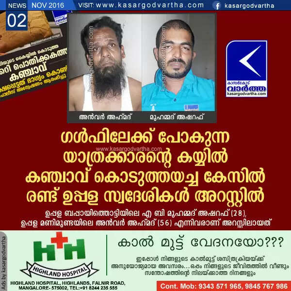 ഗള്ഫിലേക്ക് പോകുന്ന യാത്രക്കാരന്റെ കയ്യില് കഞ്ചാവ് കൊടുത്തയച്ച കേസില് രണ്ട് ഉപ്പള സ്വദേശികള് അറസ്റ്റില്