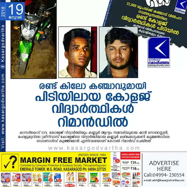 കാസര്കോട്: (www.kasargodvartha.com 19.01.2018) രണ്ട് കിലോ കഞ്ചാവുമായി പിടിയിലായ കോളജ് വിദ്യാര്ത്ഥികളെ കോടതി റിമാന്ഡ് ചെയ്തു. കാസര്കോട് ഗവ. കോളേജ് വിദ്യാര്ത്ഥിയും കണ്ണൂര് ആറളം സ്വദേശിയുമായ ഷാന് സെബാസ്റ്റ്യന്(20), മംഗളൂരുവിലെ ശ്രീനിവാസ് കോളേജിലെ വിദ്യാര്ത്ഥിയായ കണ്ണൂര് കരിക്കോട്ടക്കണി കുമ്മന്തോടിലെ ഡൊണാള്ഡ് കുഞ്ഞിമോന്(20) എന്നിവരെയാണ് കാസര്കോട് ചീഫ് ജുഡീഷ്യല് മജിസ്ട്രേറ്റ് കോടതി റിമാന്ഡ് ചെയ്തത്.