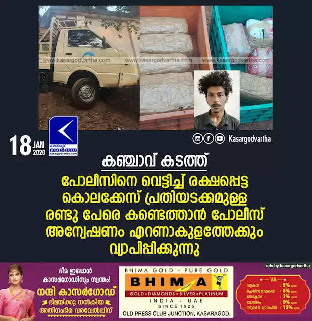 കഞ്ചാവ് കടത്ത്; പോലീസിനെ വെട്ടിച്ച് രക്ഷപ്പെട്ട കൊലക്കേസ് പ്രതിയടക്കമുള്ള രണ്ടു പേരെ കണ്ടെത്താന് പോലീസ് അന്വേഷണം എറണാകുളത്തേക്കും വ്യാപിപ്പിക്കുന്നു