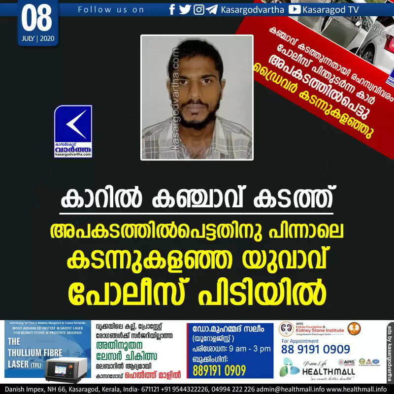 കാറില് കഞ്ചാവ് കടത്ത്; അപകടത്തില്പെട്ടതിനു പിന്നാലെ കടന്നുകളഞ്ഞ യുവാവ് പോലീസ് പിടിയില്