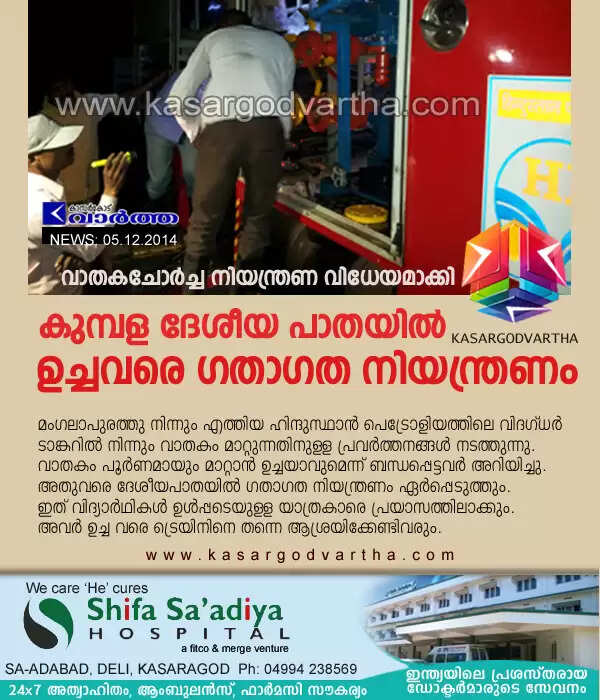 വാതകചോര്ച്ച നിയന്ത്രണ വിധേയമാക്കി, ദേശീയ പാതയില് ഉച്ചവരെ ഗതാഗത നിയന്ത്രണം