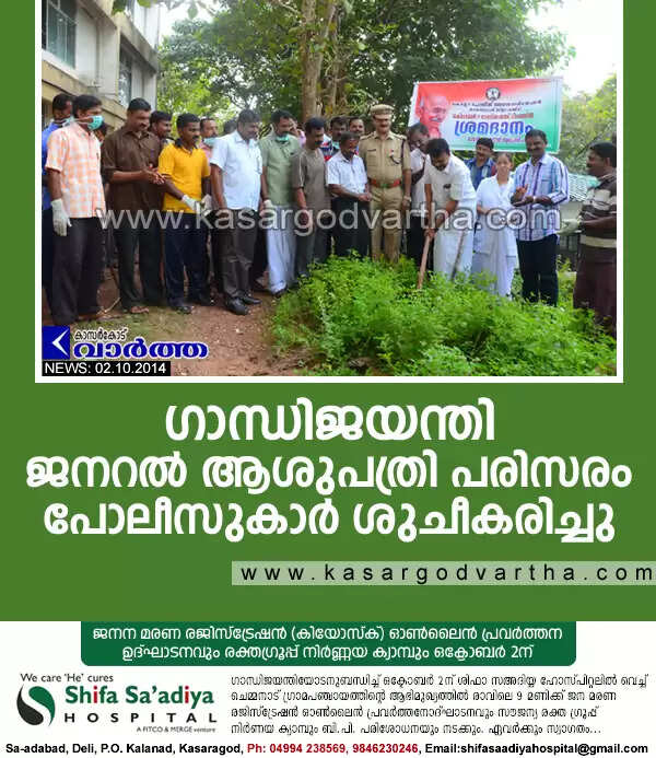 കാസര്കോട്: (www.kasargodvartha.com 02.10.2014) കേരള പോലീസ് അസോസിയേഷന് കാസര്കോട് ജില്ലാ കമ്മിറ്റിയുടെ ആഭിമുഖ്യത്തില് രാഷ്ട്രപിതാവിന്റെ ജന്മദിനം വിപുലമായി ആഘോഷിച്ചു. ആഘോഷത്തിന്റെ ഭാഗമായി കാസര്കോട് ജനറല് ആശുപത്രി പരിസരം ശുചീകരിച്ചു. ശുചീകരണ ദിനത്തിന്റെ ഉദ്ഘാടനം കാസര്കോട് എം.എല്.എ എന്.എ നെല്ലിക്കുന്ന് നിര്വ്വഹിച്ചു.