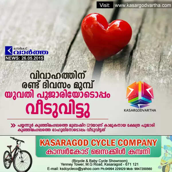 പയ്യന്നൂര്‍: (www.kasargodvartha.com 26/05/2015) വിവാഹത്തിന് രണ്ട് ദിവസം മുമ്പ് യുവതി ക്ഷേത്ര പൂജാരിയോടൊപ്പം വീടുവിട്ടു. കുഞ്ഞിമംഗലത്തെ അബ്ദുല്‍ ലത്വീഫിന്റെ മകള്‍ മുബഷിറ (21)യാണ് കാമുകനായ ക്ഷേത്ര പൂജാരി കുഞ്ഞിമംഗലത്തെ രാഹുലിനോടൊപ്പം വീടുവിട്ടത്.