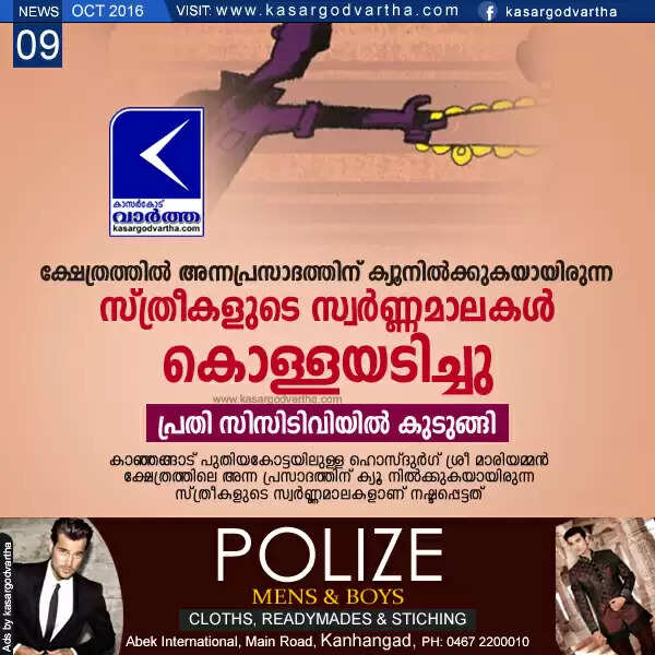 കാഞ്ഞങ്ങാട്: (www.kasargodvartha.com 09/10/2016) കാഞ്ഞങ്ങാട് പുതിയകോട്ടയിലുള്ള ഹൊസ്ദുര്‍ഗ് ശ്രീ മാരിയമ്മന്‍ ക്ഷേത്രത്തിലെ അന്ന പ്രസാദത്തിന് ക്യൂ നില്‍ക്കുകയായിരുന്ന സ്ത്രീകള്‍ക്കിടയില്‍ മോഷ്ടാവായ സ്ത്രീ നുഴഞ്ഞുകയറി സ്വര്‍ണമാലകള്‍ കവര്‍ന്നു. ശനിയാഴ്ച വൈകിട്ടാണ് സംഭവം. രണ്ടുസ്ത്രീകളുടെ സ്വര്‍ണ്ണമാലകളാണ് കൊള്ളയടിക്കപ്പെട്ടത്.