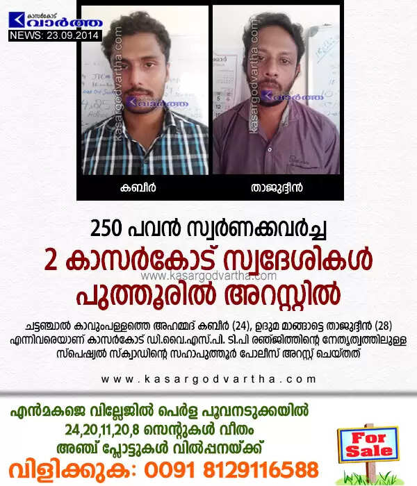 250 പവന് സ്വര്ണക്കവര്ച്ച: 2 കാസര്കോട് സ്വദേശികള് പുത്തൂരില് അറസ്റ്റില്