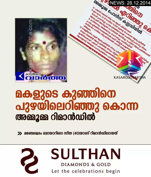 മഞ്ചേശ്വരം: (www.kasargodvartha.com 28.12.2014) പ്രായപൂര്ത്തിയാകാത്ത പെണ്കുട്ടി അവിഹിത ബന്ധത്തില് പ്രസവിച്ച അഞ്ചു ദിവസം പ്രായമായ ആണ്കുഞ്ഞിനെ പുഴയിലെറിഞ്ഞു കൊന്ന കേസില് അറസ്റ്റിലായ അമ്മൂമ്മ റിമാന്ഡില്. ഞായറാഴ്ച രാവിലെ കാസര്കോട് ജുഡീഷ്യല് ഫസ്റ്റ്ക്ലാസ് മജിസ്ട്രേറ്റിന്റെ വസതിയില് ഹാജരാക്കിയ പ്രതിയെ രണ്ടാഴ്ചത്തേക്ക് റിമാന്ഡ് ചെയ്യുകയായിരുന്നു. മഞ്ചേശ്വരം ബായാറിലെ സീത (40)യാണ് റിമാന്ഡിലായത്.