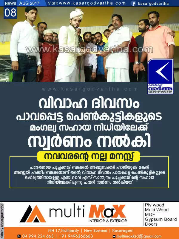 Keywords : Wedding, Youth, Kasaragod, Gold, Helping Hands, Featured, Poochakkad, Abdul Hakeem, Groom helps for poor's wedding.