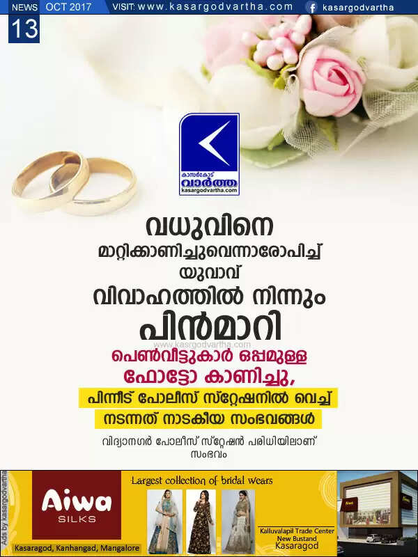 Keywords: Kasaragod, Kerala, news, Vidya Nagar, Police, Wedding, Groom withdraw from marriage; Complaint lodged, Police solved