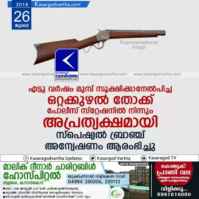 എട്ടു വര്ഷം മുമ്പ് സൂക്ഷിക്കാനേല്പിച്ച ഒറ്റക്കുഴല് തോക്ക് പോലീസ് സ്റ്റേഷനില് നിന്നും അപ്രത്യക്ഷമായി; സ്പെഷ്യല് ബ്രാഞ്ച് അന്വേഷണം ആരംഭിച്ചു