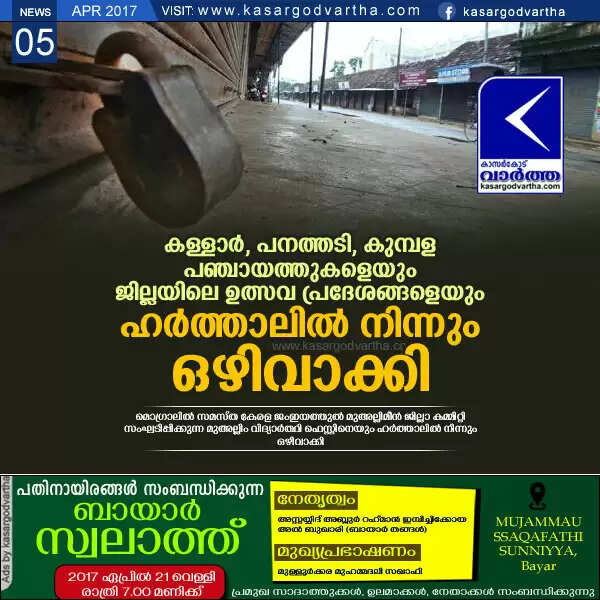 കള്ളാര്‍, പനത്തടി, കുമ്പള പഞ്ചായത്തുകളെയും ജില്ലയിലെ ഉത്സവ പ്രദേശങ്ങളെയും ഹര്‍ത്താലില്‍ നിന്നും ഒഴിവാക്കി